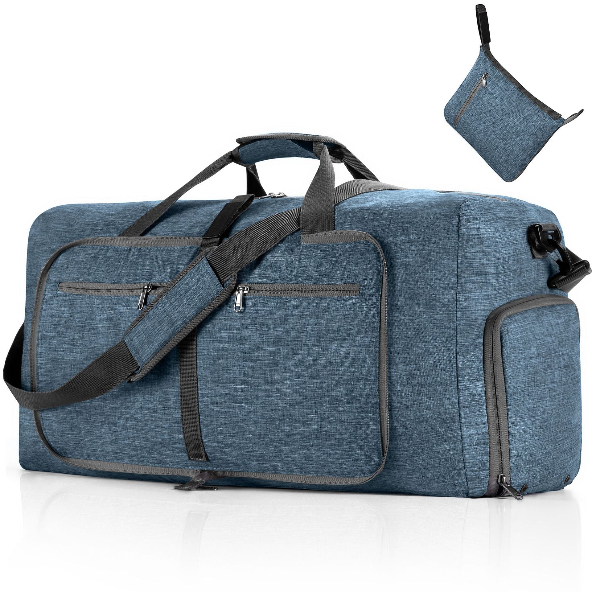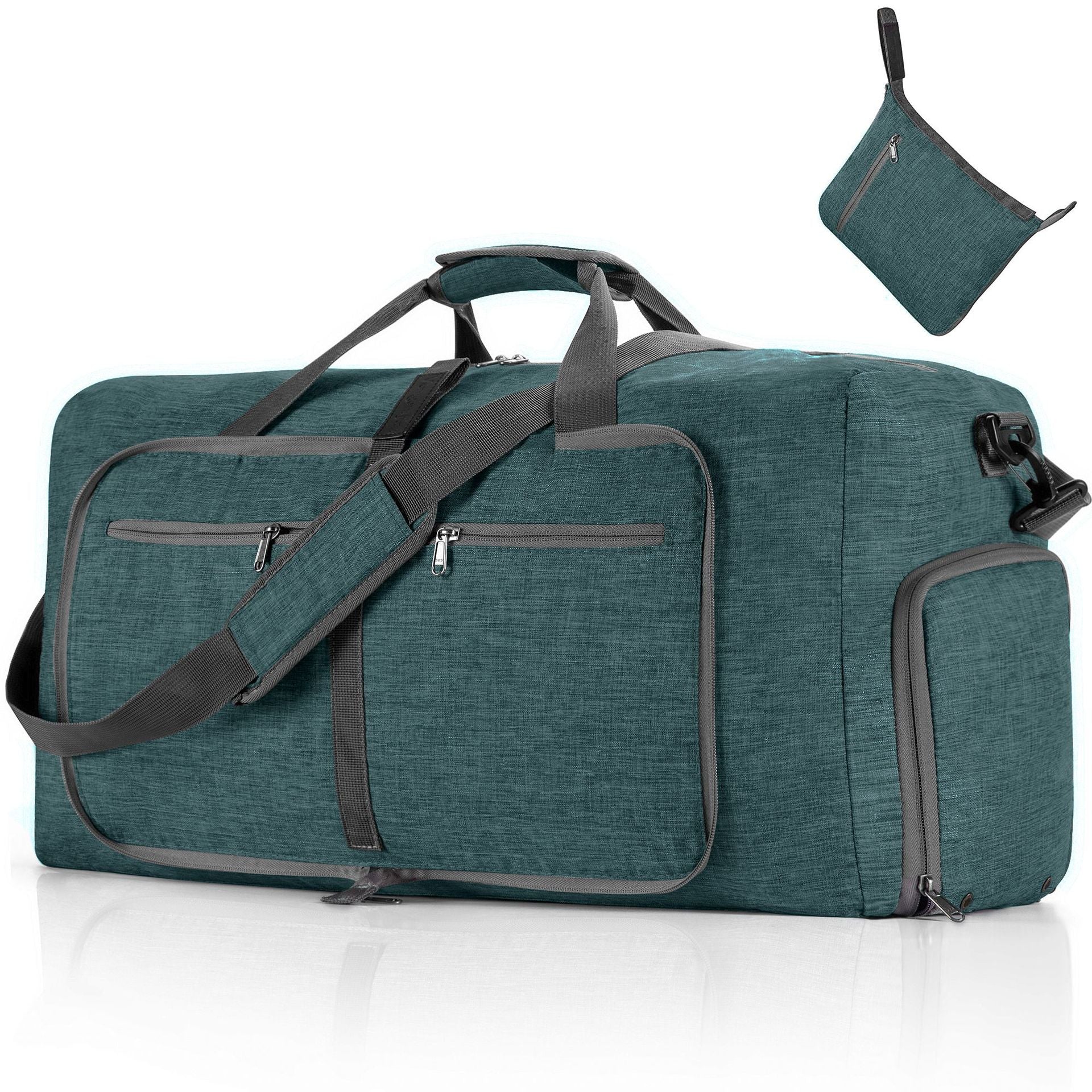 - 【Foldable & Large Duffle Bag】:Travel duffle bag large size: 24.2 x 10.5 x 13.4 inches with 65 Liters capacity. This duffel bag weighs only 0.88 pounds, the duffle can be fast folded into itself with a compact size of 9.8" x 8.5", only 1/20 of a regular size luggage. Nice weekend bag, oversized travel bag, and a duffle bag for travel.